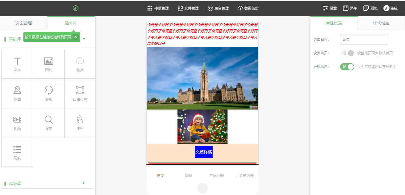 小程序在小程序编辑器中,拖入需要展示的插件(目前暂时不支持表单以及视频插件),点击生成,选择“支付宝”,并填入刚刚申请好的公钥、私钥、以及小程序ID号,点击生成即可,然后下载“支付宝小程序开发者工具”,将下载好的项目在“支付宝小程序开发者工具”中打开即可,如图所示:
